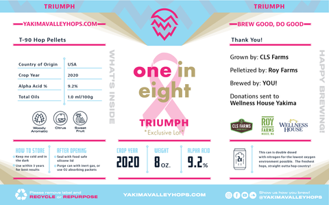 HOPS FOR CHARITY: Proceeds from the sales of this exclusive lot of 2020 Triumph go to Wellness House here in Yakima. Wellness House is a local charity that offers free support services, education, and resources to those battling cancer and other life-altering diseases. We teamed up with our friends at CLS Farms, who grew this exclusive lot of Triumph, and Roy Farms, who specially pelletized the hops to raise awareness and donations for Wellness House. Over $4 of every pound sold will be donated to Wellness House.