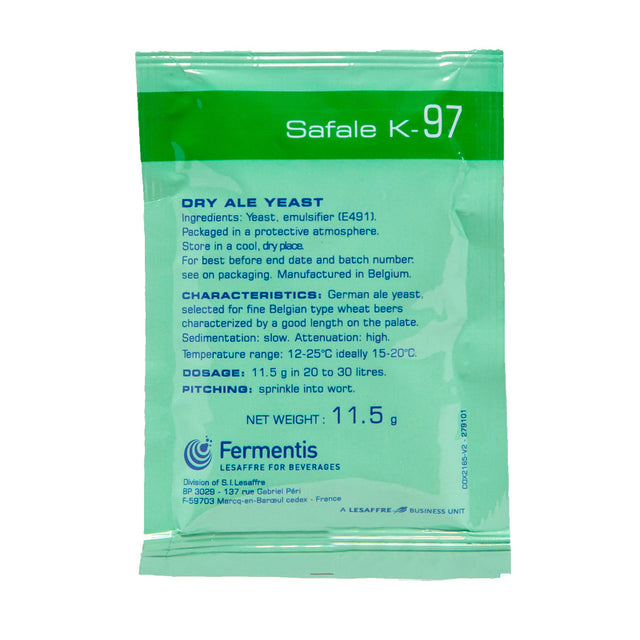 Fermentis Safale K-97 is perfect for delicately hopped beers. This German ale brewer’s yeast produces a subtle fermentation character. Depending on conditions, it tends to present a floral and balanced fruity character. This yeast is perfect for delicate beers such as German Kolsch, Belgian Wit, Altbier, NEIPA, and some versions of session beers with a quick fermentation time. Suitable for heavily hopped beers like IPAs and can form a large firm head when fermenting.