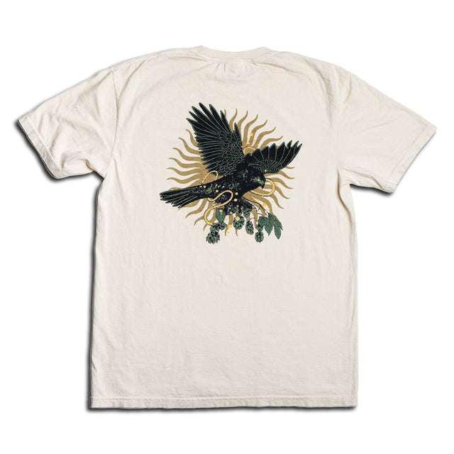 Rock out with your hops out. This is a premium heavyweight t-shirt featuring a custom, hand-drawn illustration of a Red Tailed hawk clutching a bine of hops with a brewing hose whipping around it all. The hawk design is on the back of the shirt.
